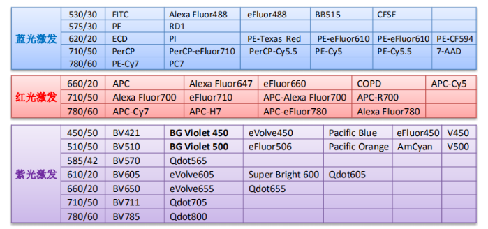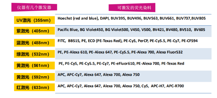 当流式细胞染色确定好指标之后,需要给每个指标对应的抗体配上相应的荧光染料,下表列出了流式细胞仪的激发器和每个激发器对应能检测的染料: