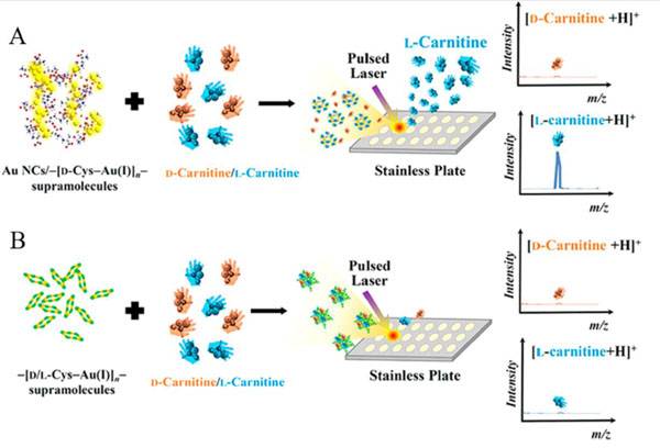 (A) Au NCs/-[D-Cys-Au(I)]n-和(B) Au NCs/-[L-Cys-Au(I)]n-超分子合成及LDI-MS分析检测手性肉毒碱示意图