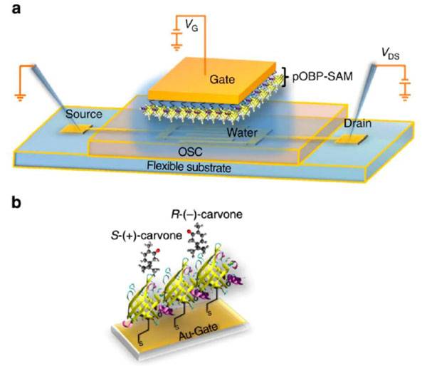图6 晶体管传感设备检测气体绑定蛋白与手性分子相互作用