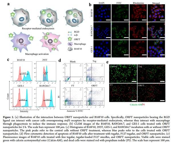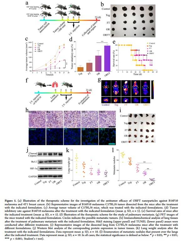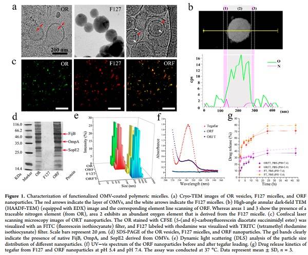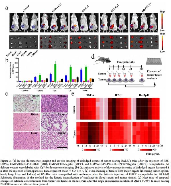 浙江大学化学系汤谷平教授与浙江大学药学院平渊研究员在肿瘤免疫治疗中取得了新的进展。陈琪博士研究生、白宏震博士基于课题组先前研究工作(Nano Lett. 2015, 15, 2732−2739),利用减毒沙门氏菌外膜囊泡(OMVs)的免疫原性、纳米尺寸合理性等特点以及避免活细菌潜在的生物安全性等问题,进一步改性细菌疗法的缺陷,在OMVs上修饰聚乙二醇和靶向肽RGD,并将普朗尼克载药纳米胶束进行包裹,聚合物胶束中负载的药物替加氟(Tegafur),该载药系统能同时发挥化学治疗和免疫调节的作用,从而增敏毒性T淋巴细胞(CTL)对肿瘤细胞的杀伤作用,与功能化的OMVs协同综合提高治疗效果。动物实验证明全身注射该新型靶向型纳米药物不仅预防肿瘤的发生起到特异性免疫的作用,而且可以显著抑制体内肿瘤的生长并延长C57BL/6小鼠的存活率。重要的是,纳米药物可以有效抑制癌细胞向肺转移。该项工作的重要意义在于细菌外膜的策略可以改善药物递送系统,为OMVs用于肿瘤临床治疗试验及转化提供了十分有益的参考。