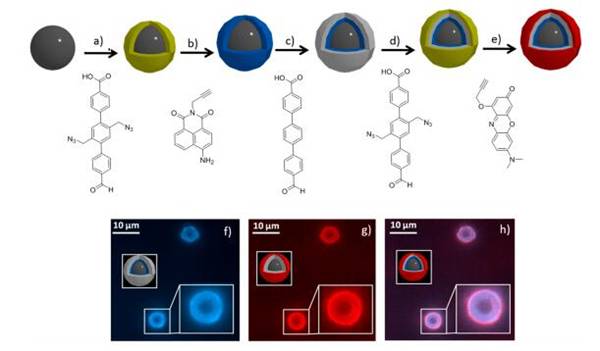 (f-g)不同滤光器的染料官能化的多壳MOF涂覆纳米颗粒的共聚焦显微镜图像:蓝色通道、、红色通道和红色和蓝色通道的叠加。