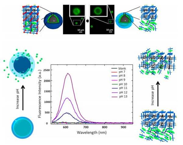 (下)通过发射光谱证实,pH引发的溶胀和从MagGel胶囊中释放染料的示意图。