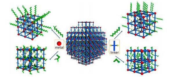 (b)正交功能位点。例如:接头骨架内的叠氮化物和烷氧基,与CL分子相互作用,点击反应机制共价互连MOF结构。