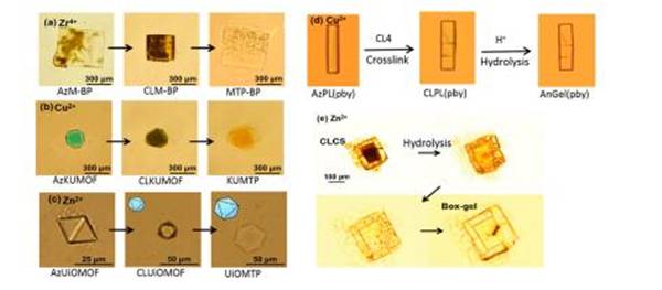 图 6 MOF转化为聚合物凝胶:AzoMOF(AzM)交联MOF(CLM)转化为MOF模板化聚合物(MTP)