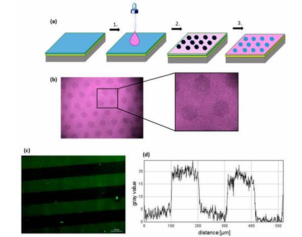 (a)六边形图案的光掩模局部限制rhodamine-SH与Zn2(BA-BDC)2(dabco)Surmof的连接体的连接示意图;