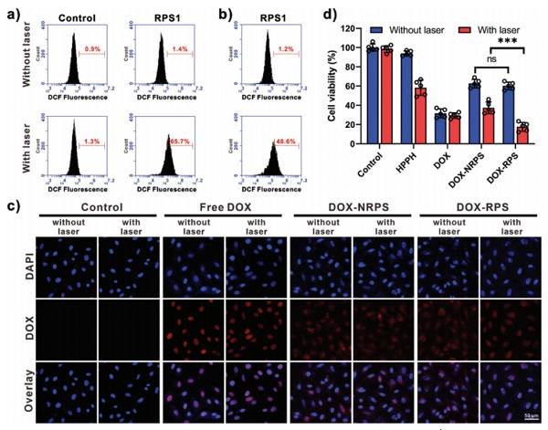 a)用DCFDA和RPS1孵育的U87MG细胞的FCM分析,然后进行激光照射 b)用DCFH-DA和激光预辐照的RPS1孵育的U87MG细胞的FCM分析 c)在有或没有激光照射的情况下,不同样品处理过的U87MG细胞的共聚焦荧光图像 d)不同样品处理过的U87MG细胞孵育48 h的存活率