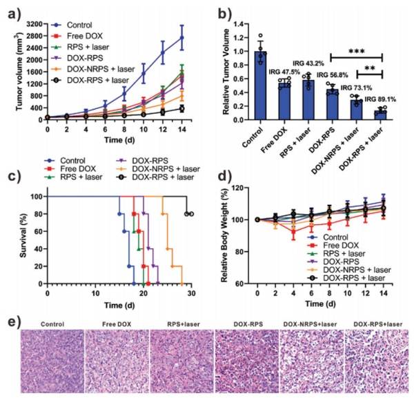 a)不同处理后小鼠的肿瘤生长曲线 b)治疗结束时的相对肿瘤体积和肿瘤生长抑制率(IRG) c)小鼠的生存曲线 d)治疗期间小鼠体重的变化 e)不同治疗后肿瘤组织的H&E分析