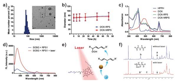 a)DOX-RPS的粒径和TEM图像(插图) b)DOX-RPS和DOX-NRPS的胶体稳定性(n = 3) c)HPPH,DOX,DOX-RPS和DOX-NRPS的吸收光谱 d)在有或没有激光照射的情况下,在存在RPS1的情况下,SOSG的FL光谱 e)激光触发LAP生成的机理 f)有或没有激光照射的RPS1的1H NMR光谱