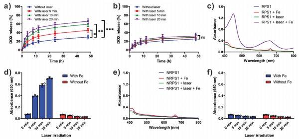 a)在没有或没有激光照射时间的情况下,DOX-RPS的体外DOX释放曲线 b)在没有或没有激光照射时间的情况下,DOX-NRPS的体外DOX释放曲线 c)在有或没有Fe2+的RPS1或激光预辐照的RPS1存在下,TMB的吸收光谱(5分钟) d)激光预辐照的RPS1对TMB氧化的比较 e)在有或没有Fe2+的情况下,在存在NRPS1或激光预辐照NRPS1(5分钟)的情况下,TMB的吸收光谱 f)激光预辐照NRPS1对TMB氧化的比较