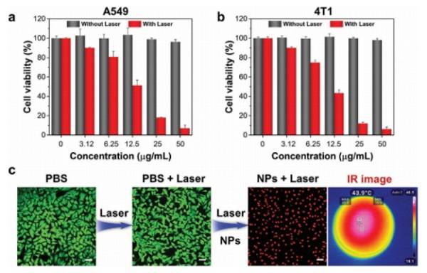 a,b)在有或没有1064 nm激光照射的情况下,用不同浓度的IR-SS NP孵育后,A549细胞(a)和4T1细胞(b)的细胞活力