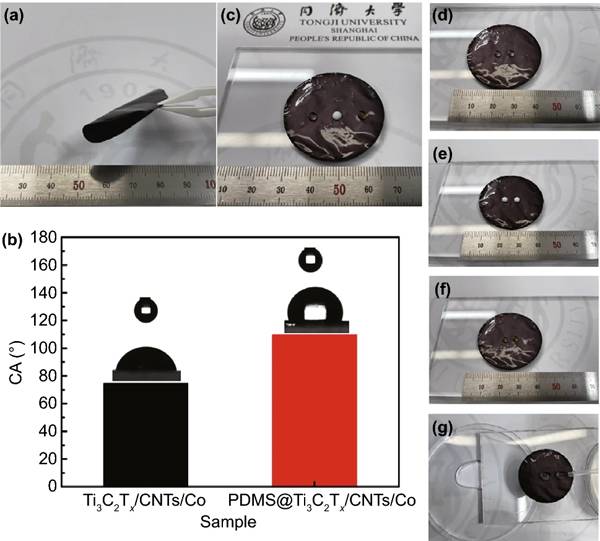 a)PDMS@Ti3C2Tx/CNTs/Co薄膜的弯曲照片。