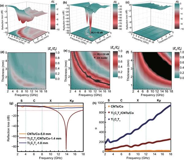 g)CNTs/Co-5.0 mm、Ti3C2Tx/CNTs/Co-1.4 mm和Ti3C2Tx-1.0 mm的RL曲线。