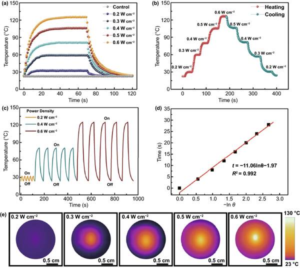 e)功率密度从0.2 W cm−2上升到0.6 W cm−2时,PDMS@Ti3C2Tx/CNTs/Co涂层的红外热像图。