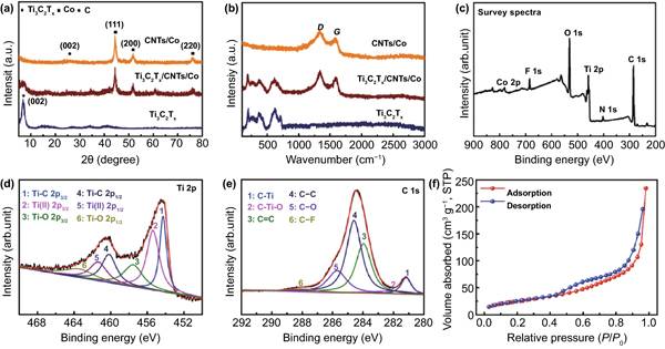 c-f)Ti3C2Tx/CNTs/Co纳米复合材料的XPS总谱(c)、Ti 2p XPS光谱(d)、C 1 s XPS光谱(e)和N2吸附-解吸等温线(f)