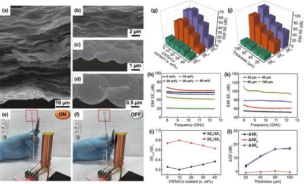 综上所述,团队通过微波辅助、原位碳化和静电组装工艺的方法,构建了具有优异的电磁波吸收、EMI屏蔽效率、柔性、疏水性和光热功能的Ti3C2Tx/CNTs/Co纳米复合材料的2D/1D/0D结构。在二维Ti3C2Tx MXene片上引入海胆状CNTs/Co纳米复合材料,形成层状Ti3C2Tx/CNTs/Co纳米复合材料,改善电磁波吸收,提高EMI屏蔽效率。通过改善衰减能力和优化阻抗匹配,层状Ti3C2Tx/CNTs/Co纳米复合材料实现了-85.8dB的强反射损耗,6.1 GHz的宽EAB,1.4 mm的超薄厚度和5wt%的超低填充量。对其基本机制的研究表明,电磁波吸收性能的提高是由一维CNTs和二维Ti3C2Tx导电网络中的电子传输产生的传导损耗,层状结构中的偶极极化和丰富的界面产生的介电损耗,0D Co纳米颗粒的铁磁共振产生的磁损耗之间的协同效应造成的。Ti3C2Tx/CNTs/Co薄膜表现出110.1分贝的高EMI SE,这是由优异的电导率、电/磁偶极极化、界面极化、自然共振和多重内反射引起的。此外,PDMS使亲水的分层Ti3C2Tx/CNTs/Co具有疏水性,其水接触角约为110.3°,可以防止MXene在高湿度条件下的降解/氧化。有趣的是,PDMS@Ti3C2Tx/CNTs/Co薄膜表现出优异的光热转换性能,具有较高的热循环稳定性和持久性。因此,研究的多功能Ti3C2Tx/CNTs/Co纳米复合材料具有独特的电磁波吸收和EMI屏蔽效率、光驱动加热性能、柔性和防水特性,这是非常有前景的下一代智能电磁衰减系统。