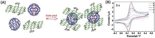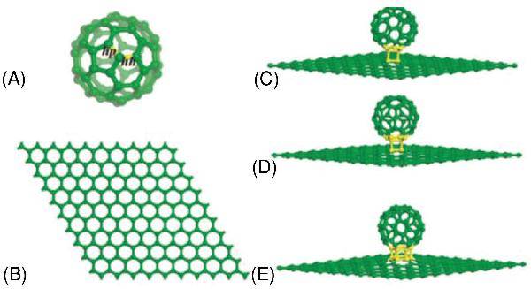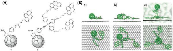 富勒烯和石墨烯的非共价复合主要包括形成石墨烯/富勒烯双层膜或将原始富勒烯(或衍生物)与石墨烯进行物理混合。构建由富勒烯和石墨烯组成的混合纳米结构的方法之一是将C60沉积到石墨烯膜上以形成双层混合物;这样,可以研究C60和石墨烯之间的界面电子相互作用和电荷转移。此外,通过物理混合两种组分,也可以容易地制备富勒烯与石墨烯的非共价杂化物。 与原始富勒烯不同,富勒烯衍生物具有通过化学官能化接枝的多种官能团,能够促进其在不同基底(如石墨烯膜)上的组装。