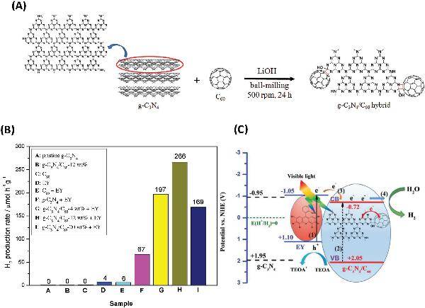作为一种新型类石墨烯2D纳米材料,g-C3N4具有独特的电子和光学性质以及较高的热/化学稳定性,在光催化和能源相关领域具有重要的应用。g-C3N4作为非金属催化剂用于可见光下有机污染物降解以及分解水制氢已得到广泛研究。 然而,原始C3N4由于光生电子-空穴对的复合率较高,光催化活性受到限制,应归因于其相对较大的带隙(≈2.7eV)以及纳米片之间存在接触电阻。考虑到C60具有优异的电子传输能力,有利于供体分子的光生电荷快速转移以及降低光生电子-空穴对的复合,研究人员将g-C3N4与C60进行复合,验证了这一策略在改善光催化性能的效果。