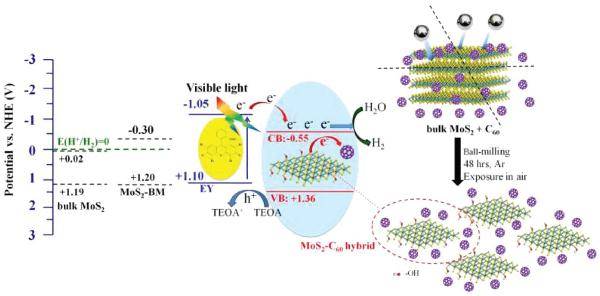 作为另一类新型无机2D半导体纳米材料,过渡金属二硫化物(TMDs)由于其有趣的电子、光学和机械性质而引起了广泛的关注,二硫化钼(MoS2)是其中***具代表性的材料。单层MoS2具有约1.8eV的直接带隙以及较高的面内载流子迁移率,在光/电催化、光伏和光电器件领域具有广泛应用。尽管研究人员对MoS2在光催化制氢领域中的作用进行了广泛的研究,但即使是单层MoS2,其光催化活性也相对较低,因为只有其边缘具有高催化活性,而其基面是无活性的。与石墨烯和g-C3N4类似,构筑MoS2与包括富勒烯在内的其他功能材料的复合材料可有效提高MoS2的光催化制氢活性。